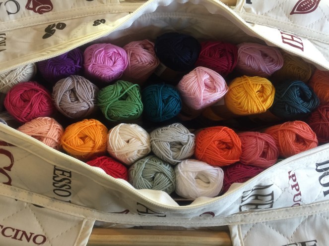 Vi började skriva meddelanden till varandra där vi pratade om olika virkprylar. Tro mig, det finns hur mycket som helst att prata om när det kommer till saxar, nålar, väskor, fodral,… Efter en hel del pratande undrade hon om jag ville vara med vid lanseringen av hennes nätbutik Favoritgarner http://www.favoritgarner.se och i samband med det, den svenska lanseringen av det holländska garnet Scheepjes. Självklart ville jag det! I veckan som gick fick jag en avi för att hämta ut följande paket.