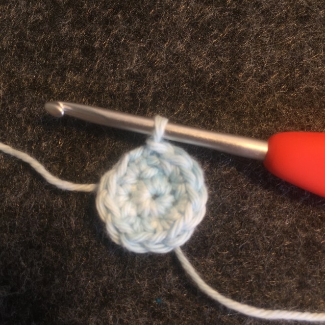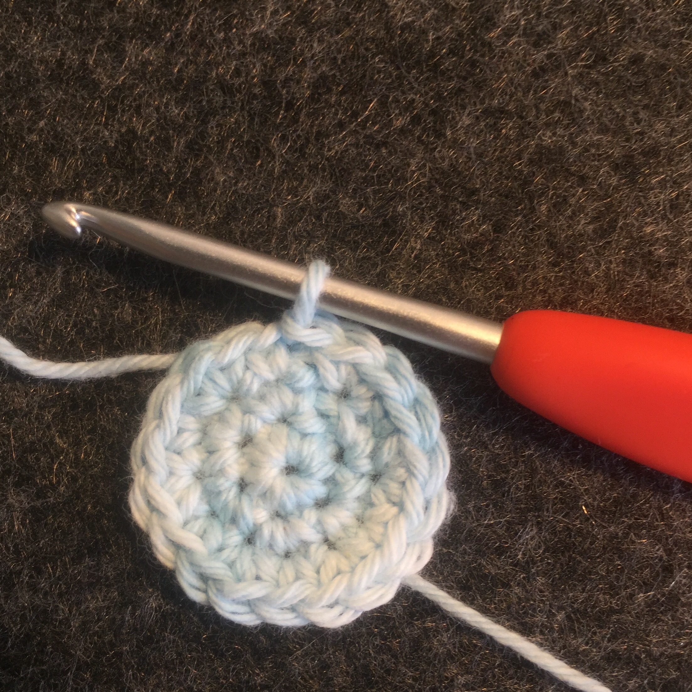 1. Färg 1. Gör en magisk ring. 6 fm i ringen, stäng med en sm i den första maskan. (6)