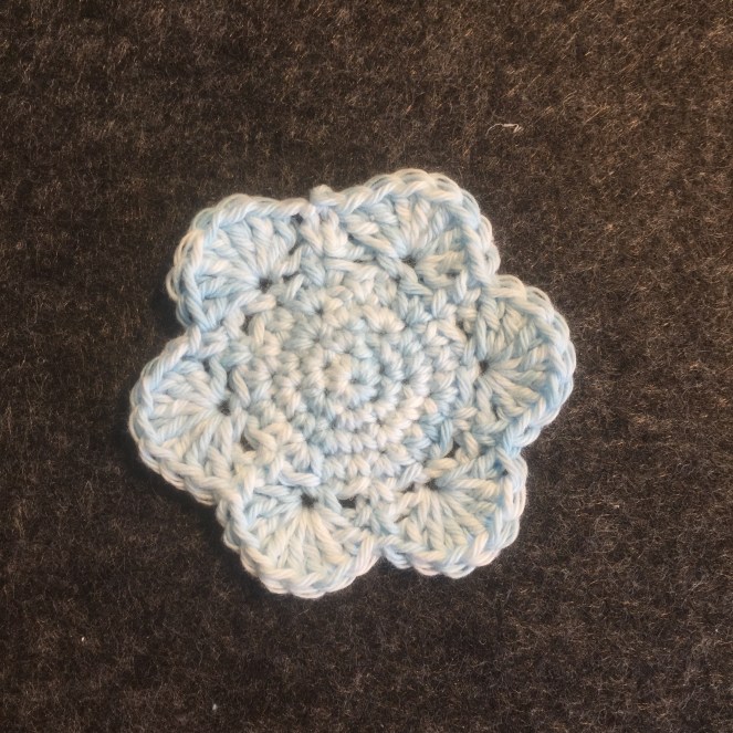 6. 1 lm (räknas inte som maska), fm i samma maska, * 7 st i nästa fm, fm i nästa fm *, upprepa från * ytterligare 4 gånger, 7 st i nästa fm, stäng med en sm i den första fm. Klipp av garnet. (6 fm, 42 st)