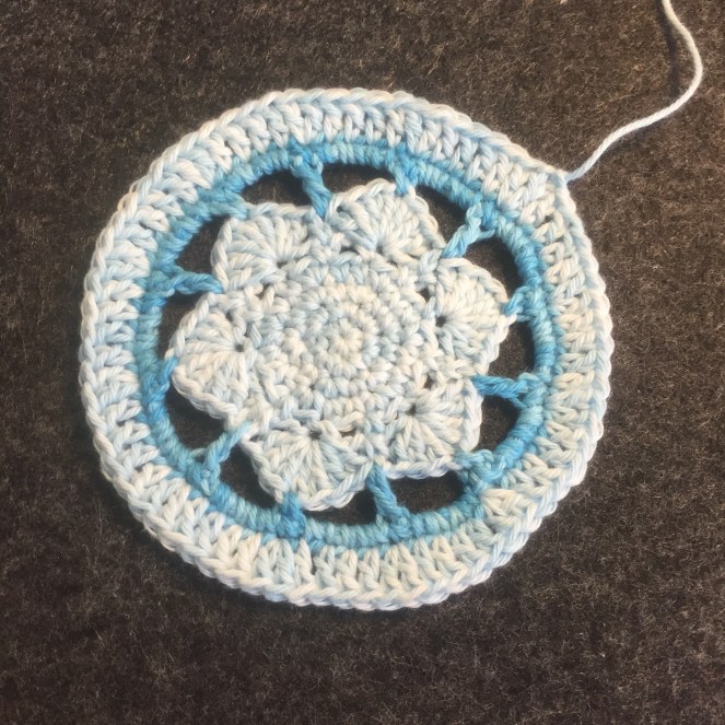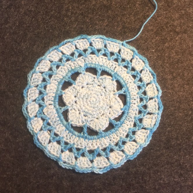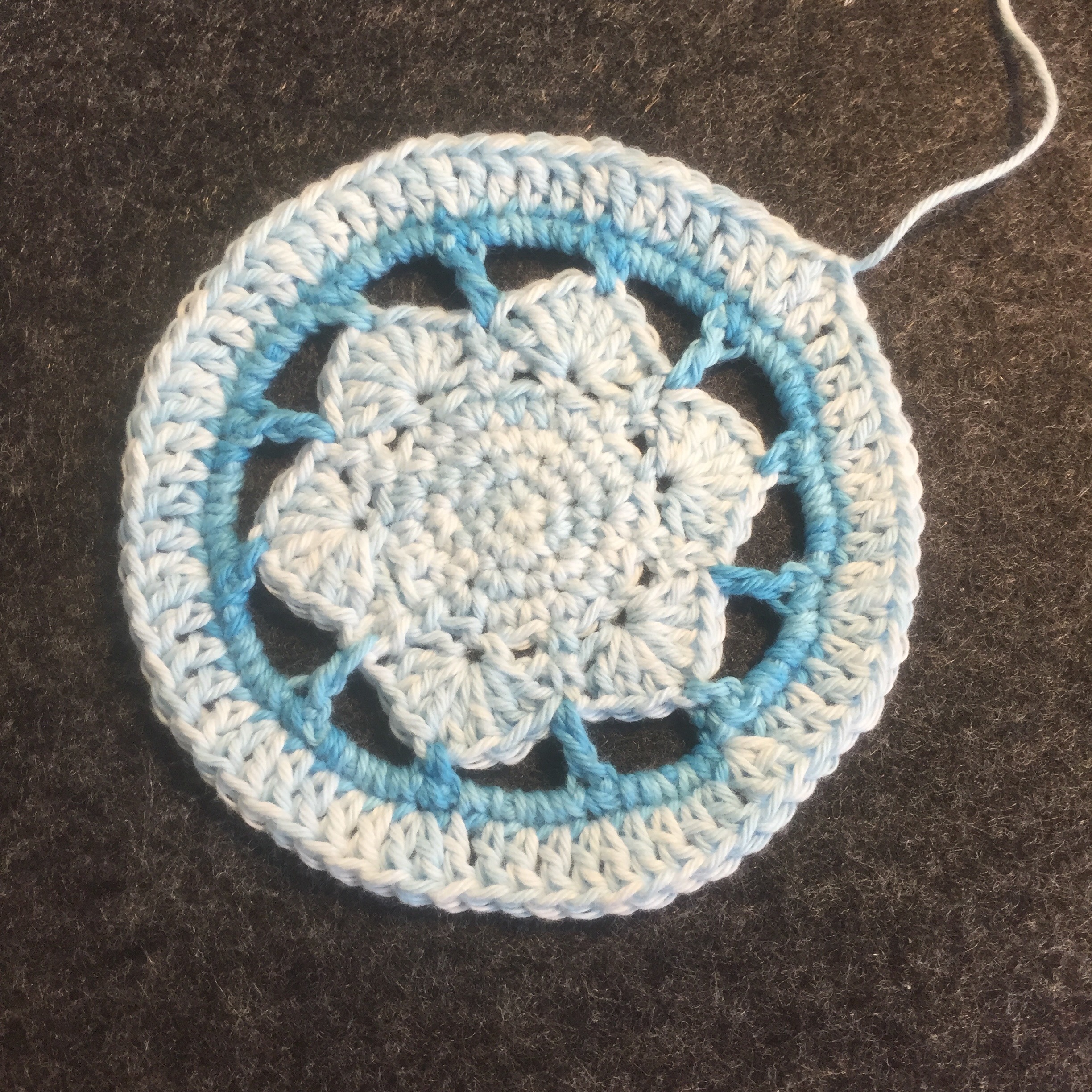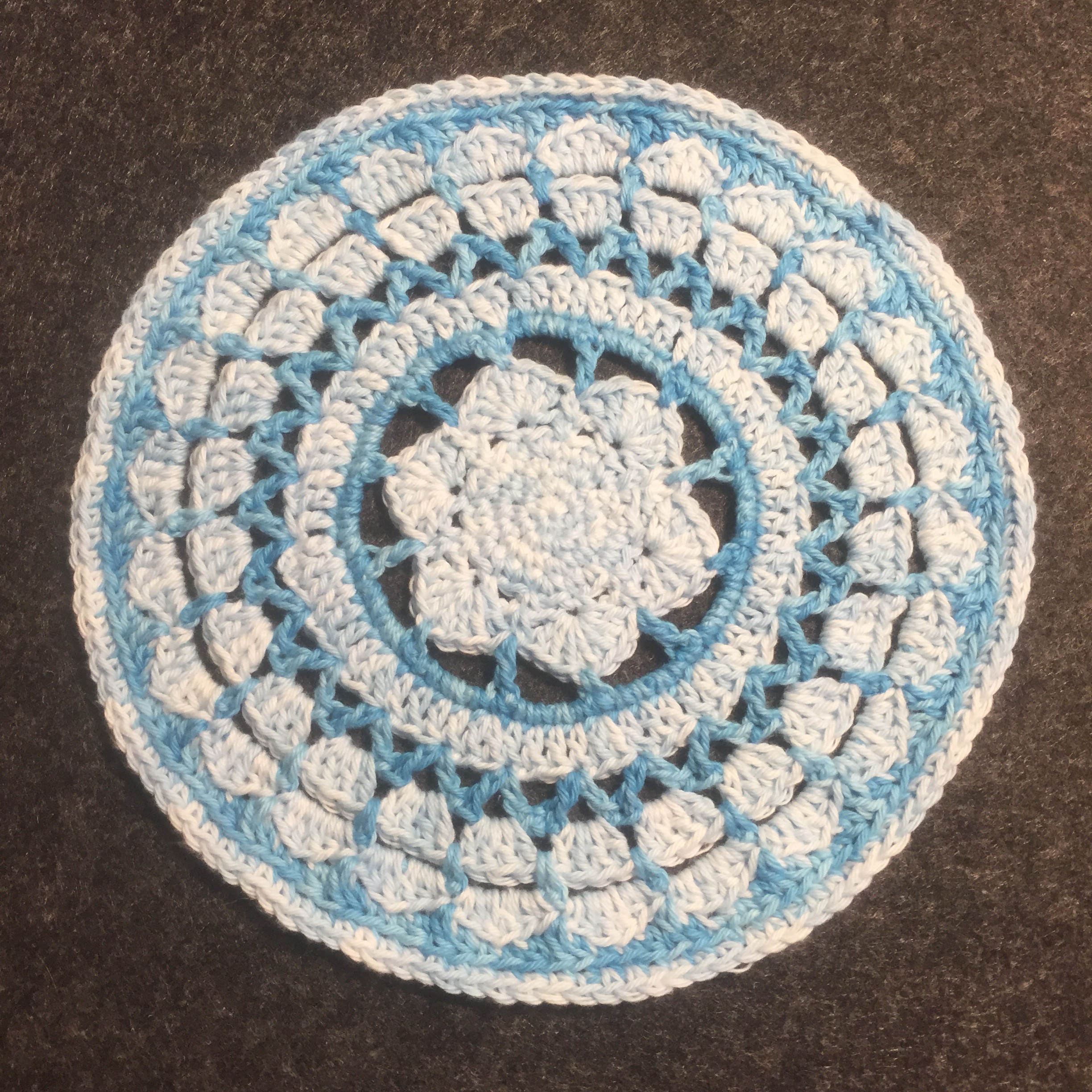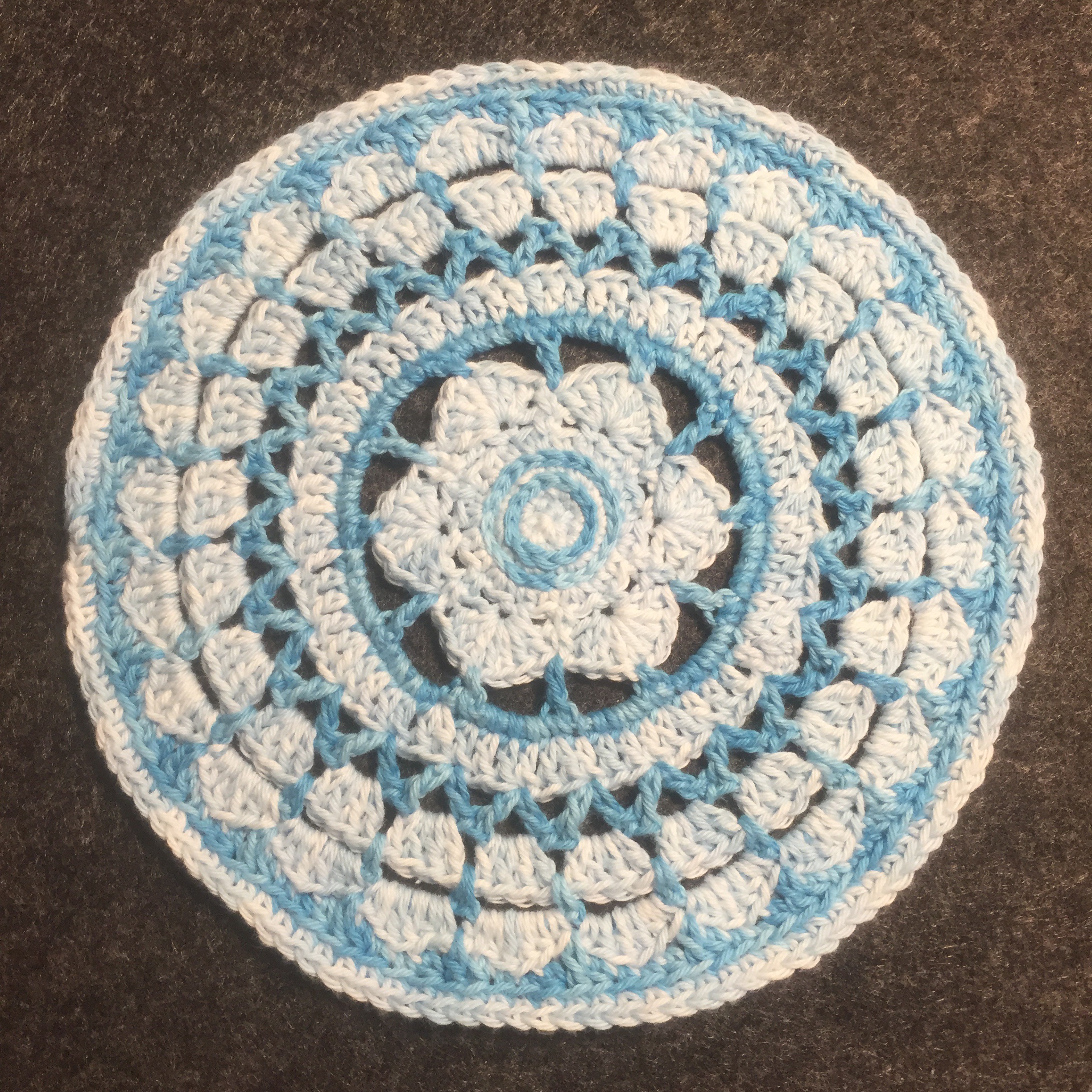 Nu är jag äntligen färdig med mitt första mönster! Det är en liten mandala som går att använda som drömfångare, sy på som dekoration på t. ex. en kudde eller väska, som duk eller något annat. Det är fantasin som sätter gränserna. Den färdiga mandalan är 17,5 cm i diameter.