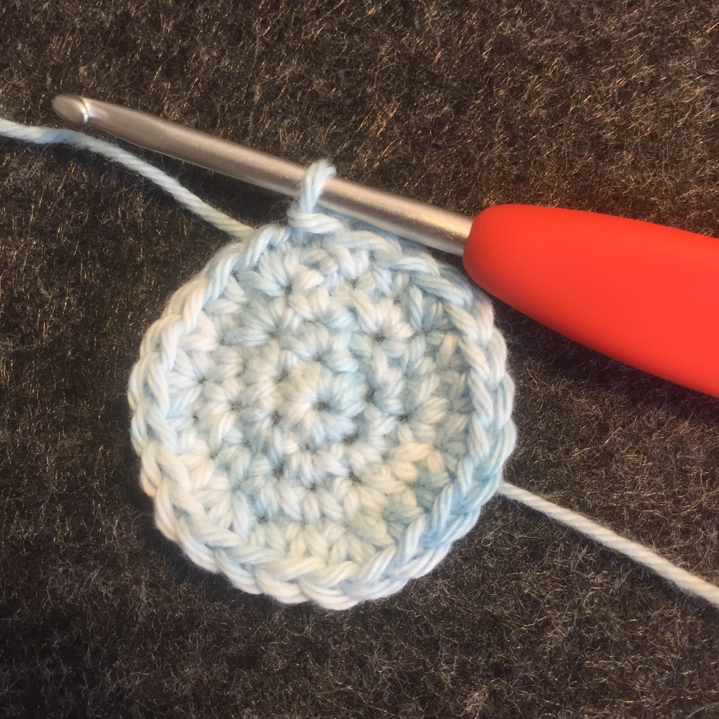 2. Ch 1 (does not count as a stitch), 2 sc in each stitch, close with a ss in the first stitch. (12)
