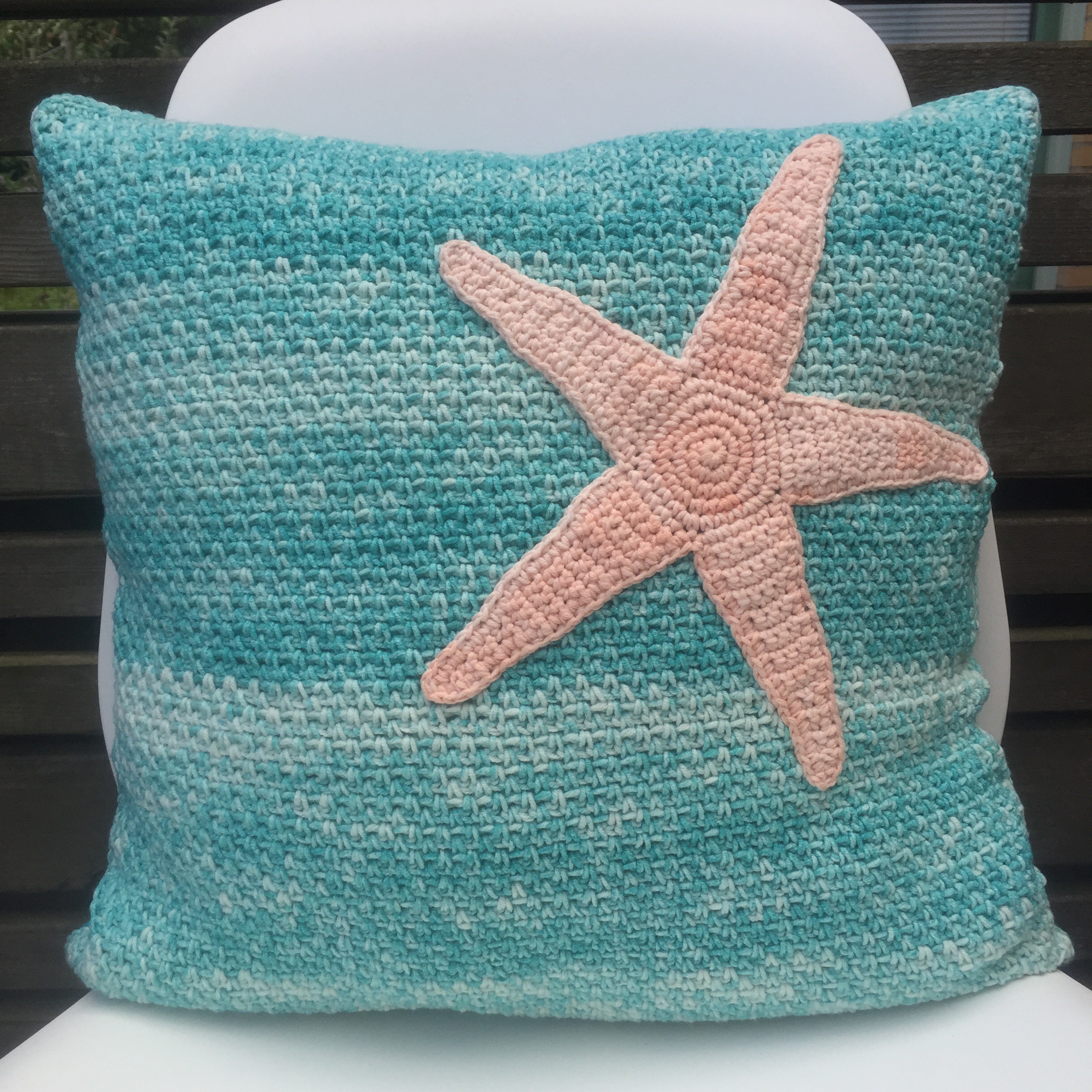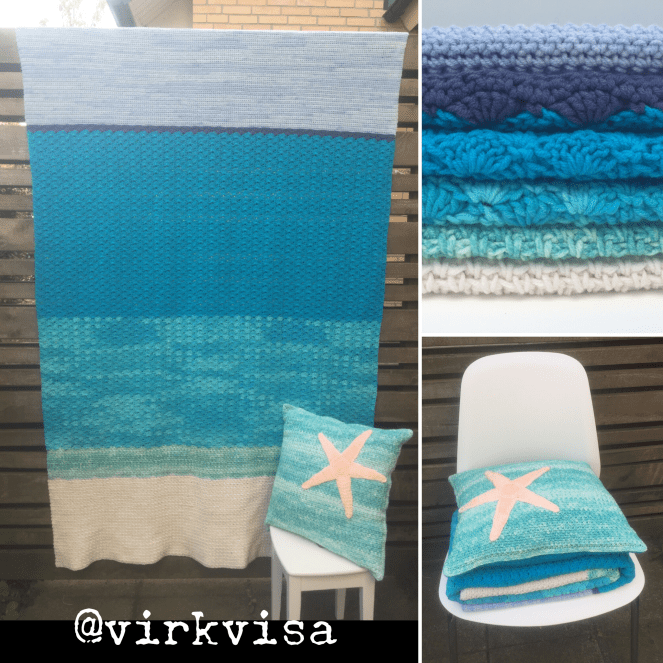 Fantastiskt fin pläd och kudde! Vad har du använt för garn till kudden med sjöstjärnan? Villhöver….