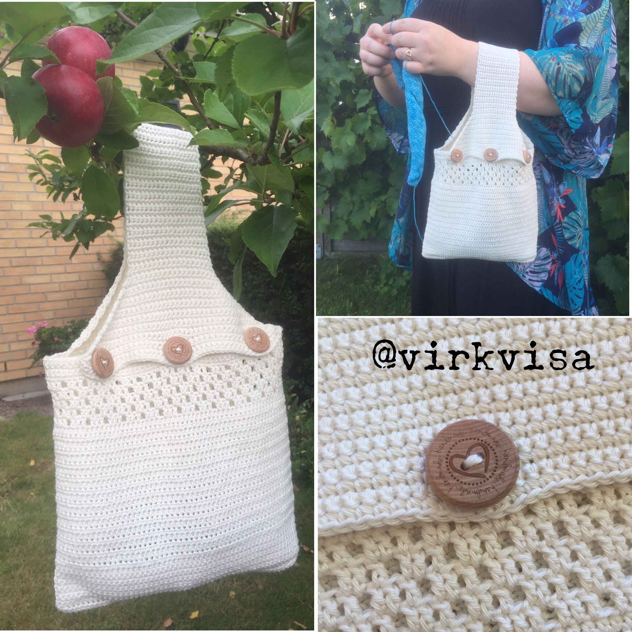 🇸🇪 Jag är den sortens virkare som har med mig min virkning i stort sett överallt men jag saknade en smidig väska som jag kunde hänga över armen eller stolsryggen. Den fjärde väskan jag provvirkade blev till slut som jag tänkt mig. Lagom stor, snygga sömmar och den går att öppna och stänga.