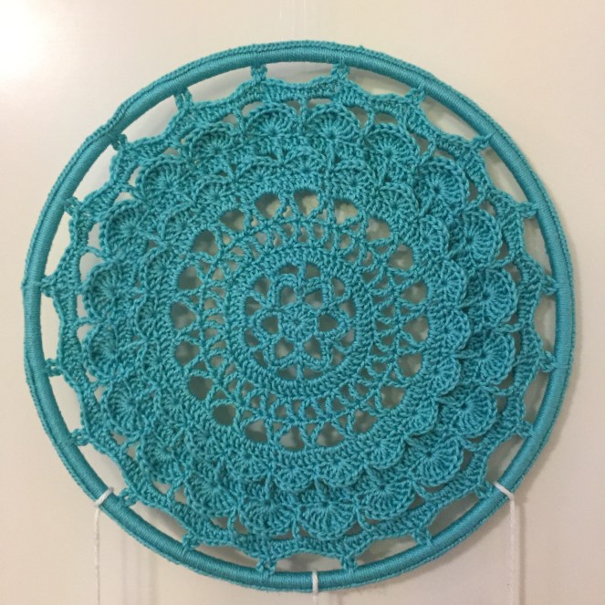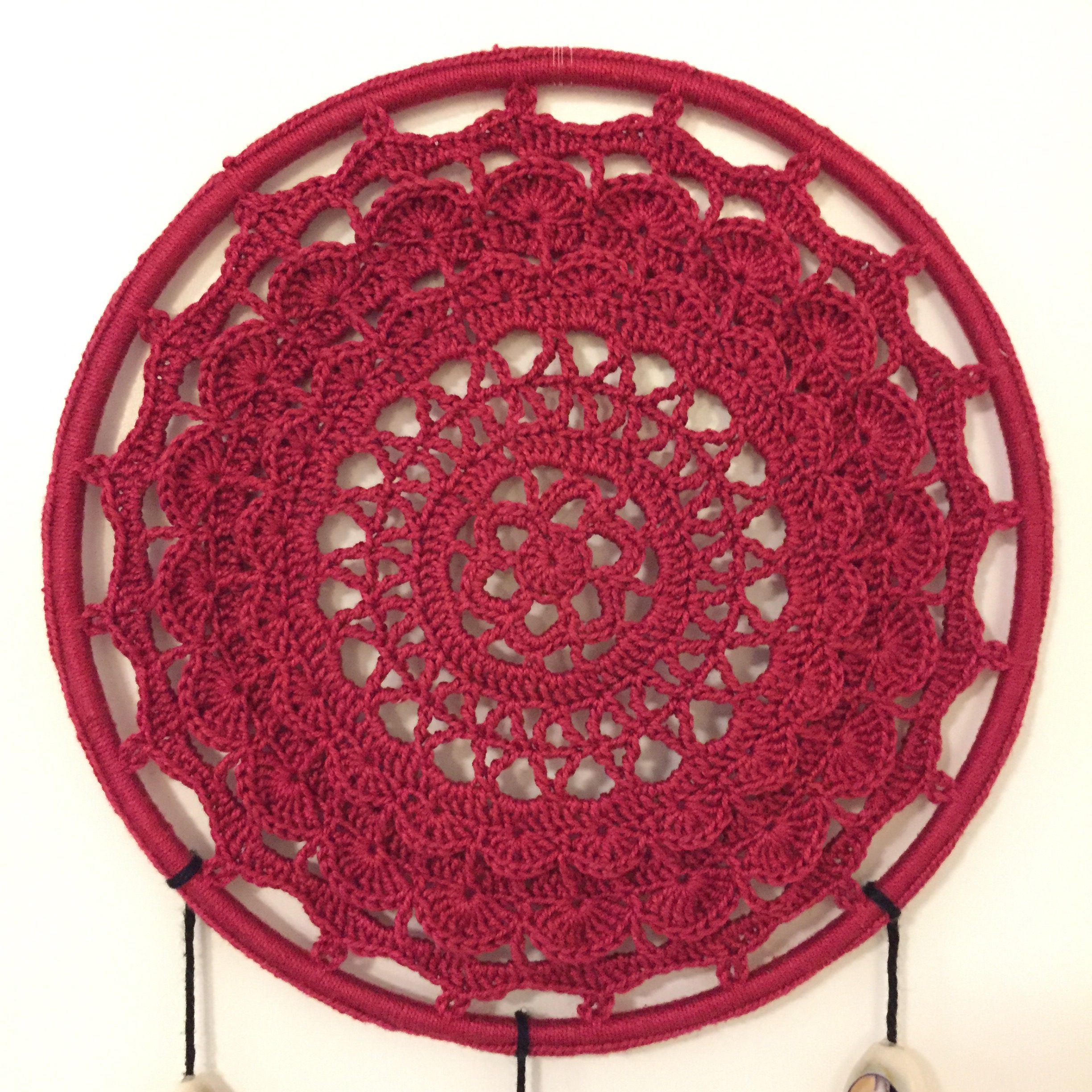 Ss into picot. Attach the dreamcatcher to the hoop with sc. Start with a sc around the hoop and in the picot you are in, 17 sc around the hoop between the picots, 1 sc around the hoop and in the picot, continue all the way around. Close with a ss in the first dc.