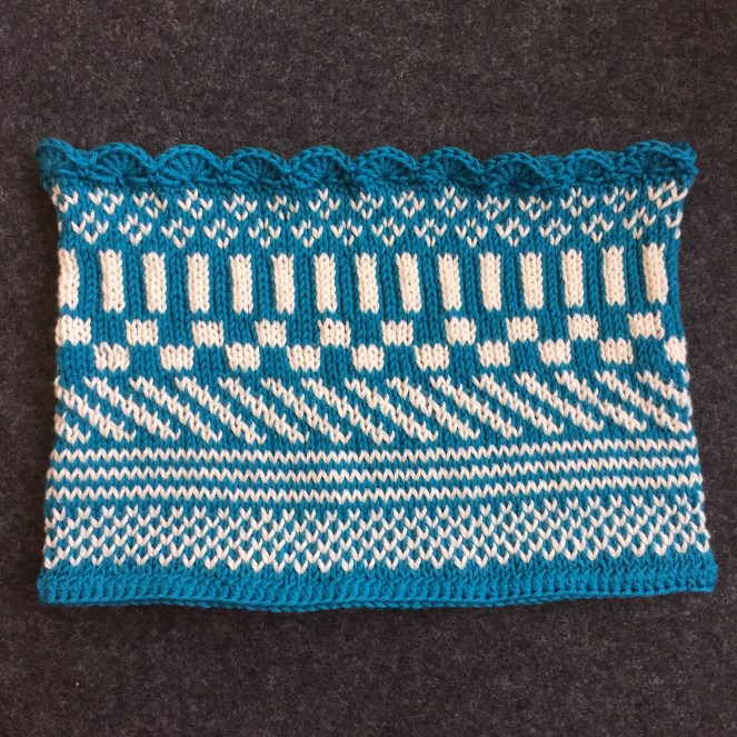 đșđž The day before yesterday I was going to knit stripes in a different way, but I couldn’t remember how to. So I turned to the very reliable youtube. After watching a bunch of videos, I decided that I wanted to try fair isle knitting. The most dificult thing was to figure out how to hold the yarn. I didn’t manage to get both of the threads to run smothly over my left index finger, so I tried to hold one strand in my left hand and one in my right combining Continental and english knitting. It went better than I had expected! I played with the tecnique without using a pattern. The end result is a cowl with a crocheted edge both up and down. The yarn is Viking BjĂžrk, bought at favoritgarner.se