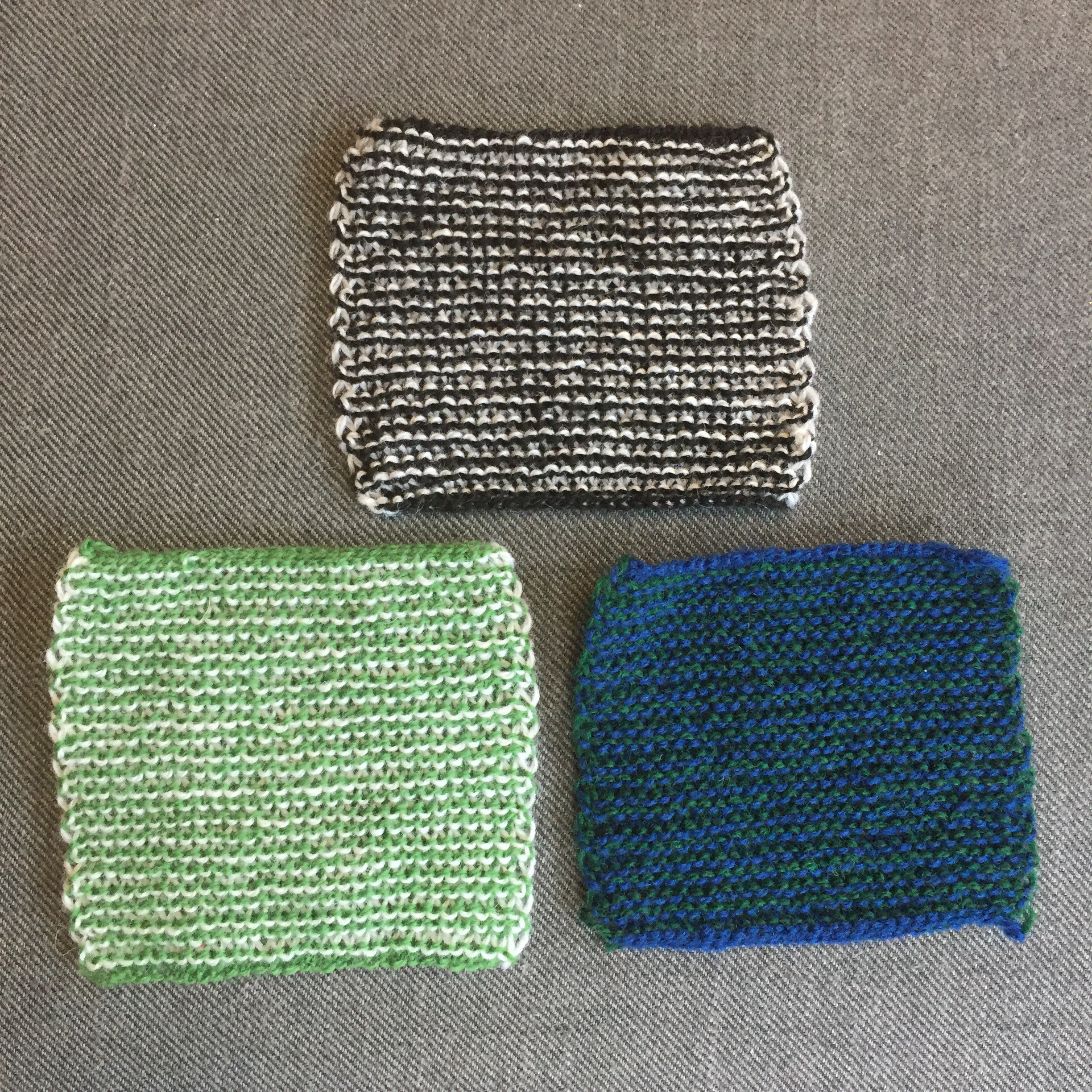 đžđȘ Vi jobbar med rĂ€nder just nu, och stickar dĂ€rför med tvĂ„ fĂ€rger. Detta Ă€r en stor utmaning för mig eftersom jag försöker fĂ„ till maskorna samtidigt som jag försöker lĂ€ra mig att hĂ„lla garnet pĂ„ ett annat sĂ€tt Ă€n nĂ€r jag virkar. Men efter mĂ„ngt och mycket fick jag till dessa tre provrutor.