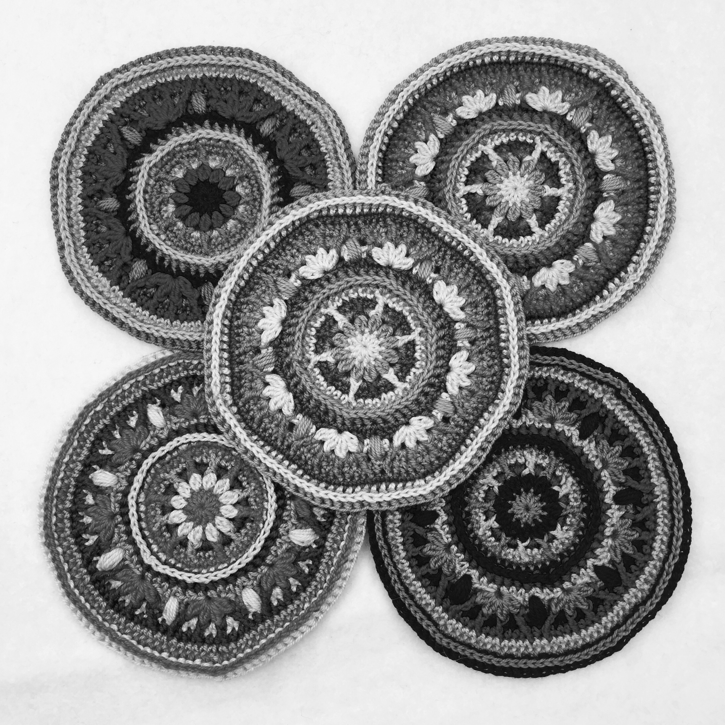 I have crocheted these one colour per row. The blue one is the same as you have seen before. The colour placements goes from the lightest to the darkest on the grayscale. On the bottom right one I have also used colours that are placed from light to dark on the grayscale, but I have placed the colours in a way so they’re not gradient from light to dark. Instead, I have tried to place them so there is as big contrast between the colours that are next to each other. For the last mandala, I didn’t chose colours depending on where they were placed on the grayscale. I just picked four random colours.