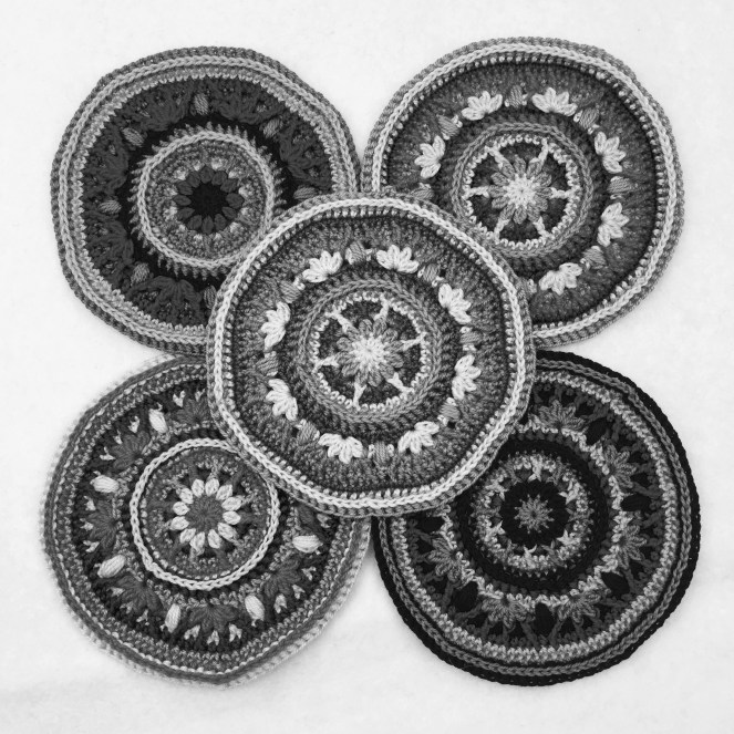 Two of the things we have been learning about is (and this is where I don’t know the correct terms) pattern articulation and transposing. I’m going to try to explain to you what it’s all about and therefore I have crocheted five versions of part 1 of the cal atlanticus.