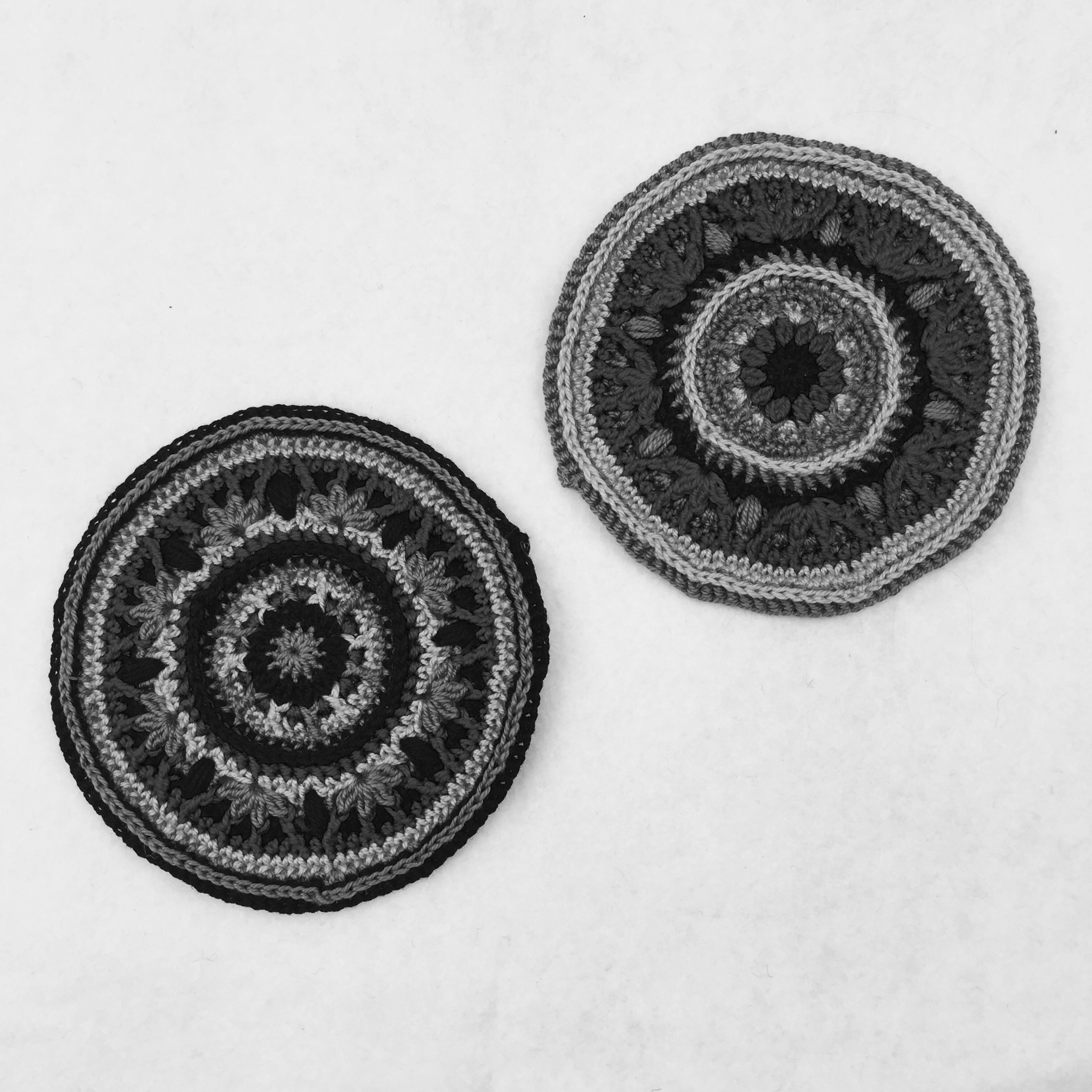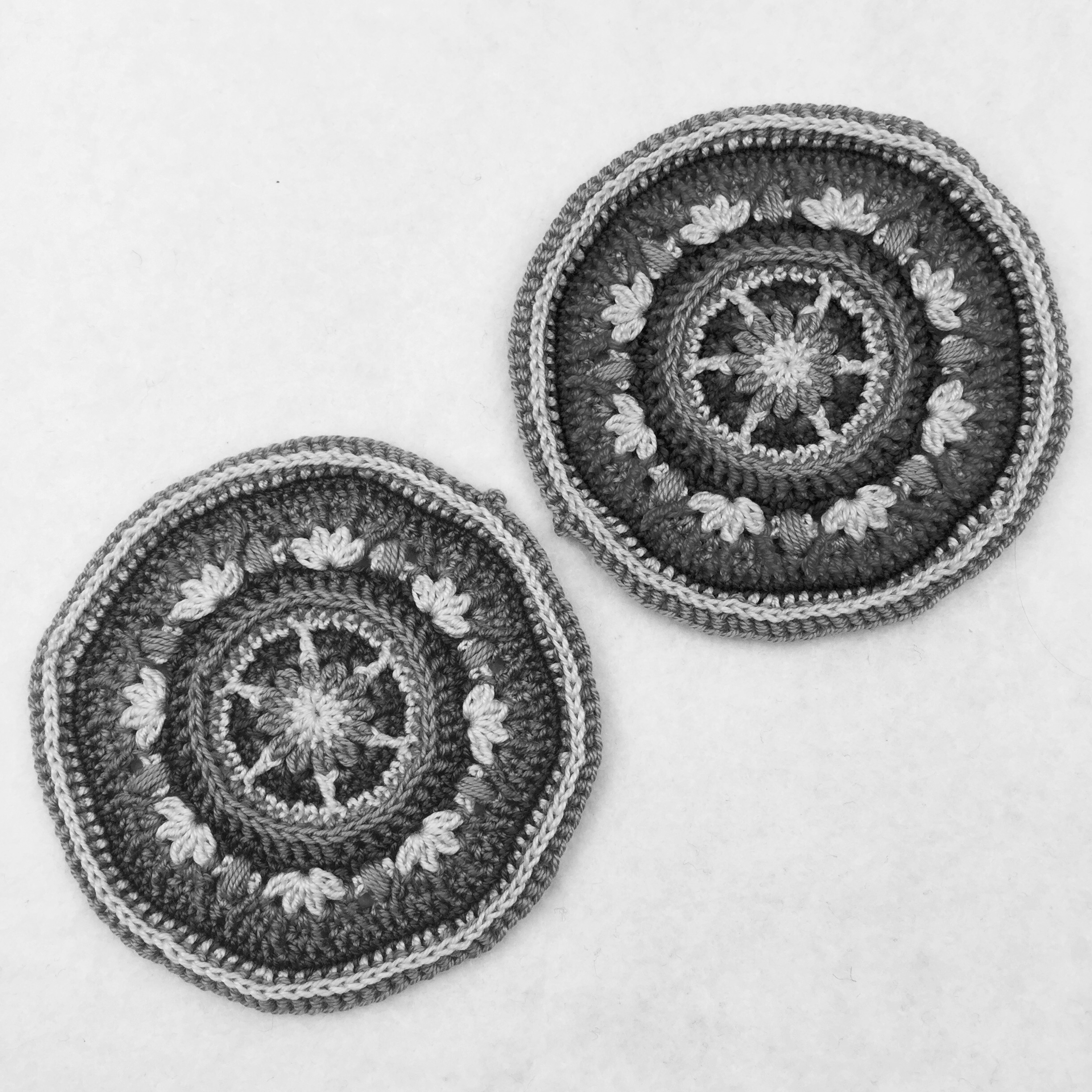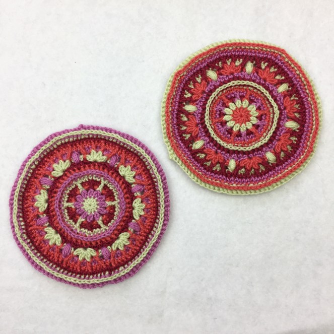 In this picture you can see how I’ve been working with transposing. It means that I have tried to keep the looks of the pattern, in one colour combination, in a different colour combination. If you look at the picture you can see that the center is light on both of the mandalas, there are six light stripes outside of the center flower, there is a dark circle, you can clearly see that the flowers have four petals each etc.