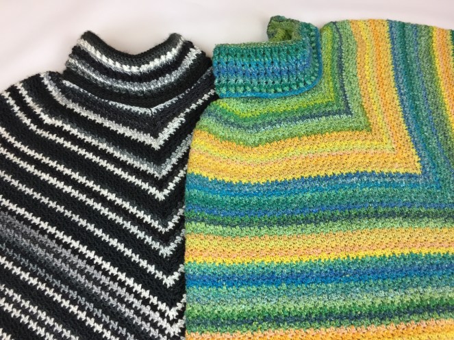 När jag virkat klart min första poncho virkade jag en till i garnet Wanderlust av märket Scheepjes. Det är aningens tunnare, har en helt annan lyster än Secret Garden. Det är dessutom självrandande och därför behöver man inte sätta ett garnpaket med flera olika färger.